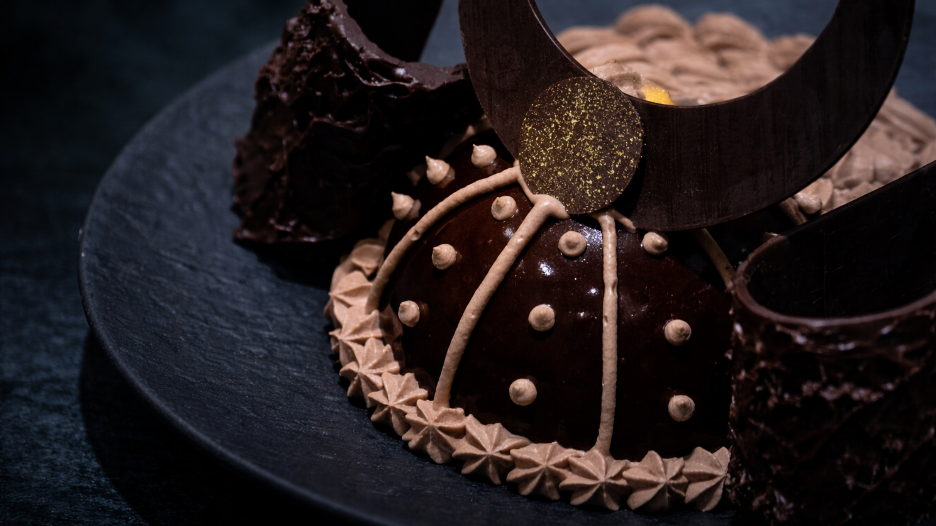 チョコレートの装飾は、兜を象徴する「鍬形」と「吹き返し」をイメージ。